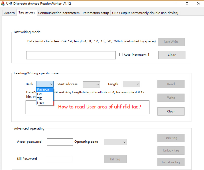 Untuk membaca data area PENGGUNA, disarankan Anda melihat perjanjian EPC. Beberapa operasi dasar EPC adalah membaca, menulis, mengunci, dan menghentikan akses.